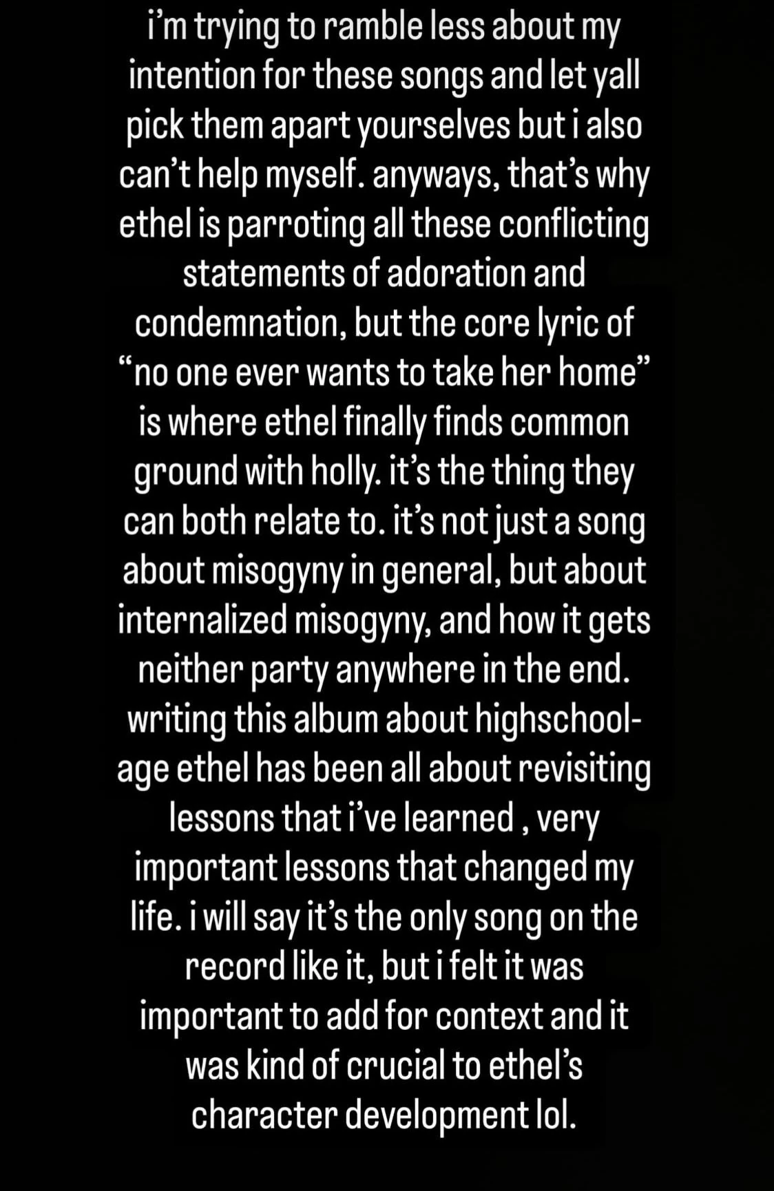 | “ | Writing this album about high school-age Ethel has been all about revisiting lessons I've learned, very important lessons that changed my life. | ” |